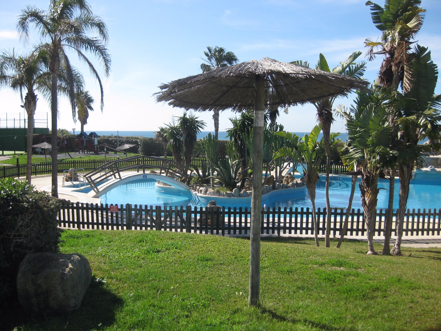 Alquiler de maravilloso Atico-dúplex de 75 m2 en una 4ª planta. Consta de gran salón, 1 cuarto de baño, cocina, primera terraza de 12 m2 con acceso a salón, 2ª terraza/solarium de 40 m2 con vistas al mar y a la playa y garaje cubierto. Amplias zonas ajardinadas, con 2 piscinas y 2 pistas de tenis/p