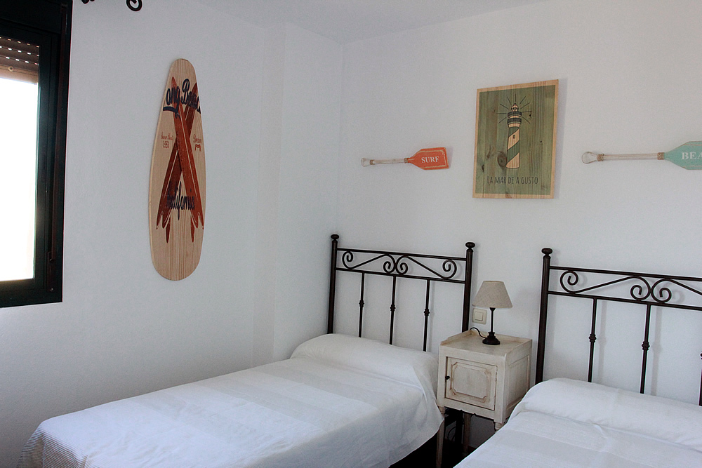 Alquiler de gran y luminoso frontal de 106 m2 situado en una segunda planta. Dispone de amplio salón con salida a terraza de 10 m2 con maravillosas vistas al mar, cocina totalmente equipada con lavadero, 3 dormitorios y 2 cuartos de baño. Internet fibra óptica 100 Mb. Está situado a 1,8 Km de Zahara y en primerísima línea de playa. También dispone de garaje cubierto. Urbanización cerrada y vigilada con amplios jardines, que consta de 2 piscinas, 2 pistas de paddle y zona de juegos infantil.