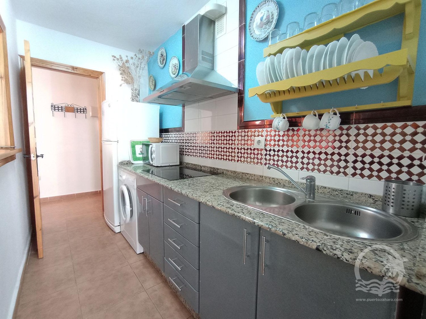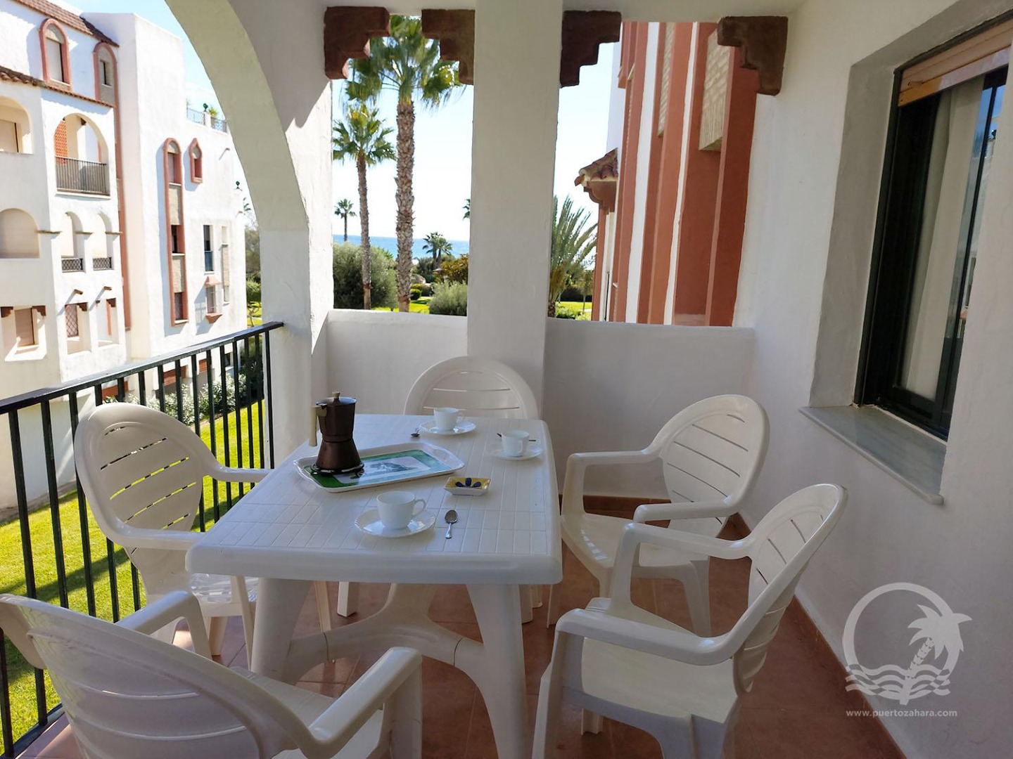 Alquiler de coqueto apartamento de 75 m2 semifrontal en urbanización a pie de playa con 2 piscinas y 2 pistas de tenis-paddle. Situado en una segunda planta con estupendas vistas al mar. Consta de salón, dos dormitorios, dos cuartos de baño, cocina, terraza de 12 m2 con estupendas vistas del mar y garaje cubierto, así como terraza lavadera. Está a 3 minutos de Zahara. A pie de la playa de Atlanterra.