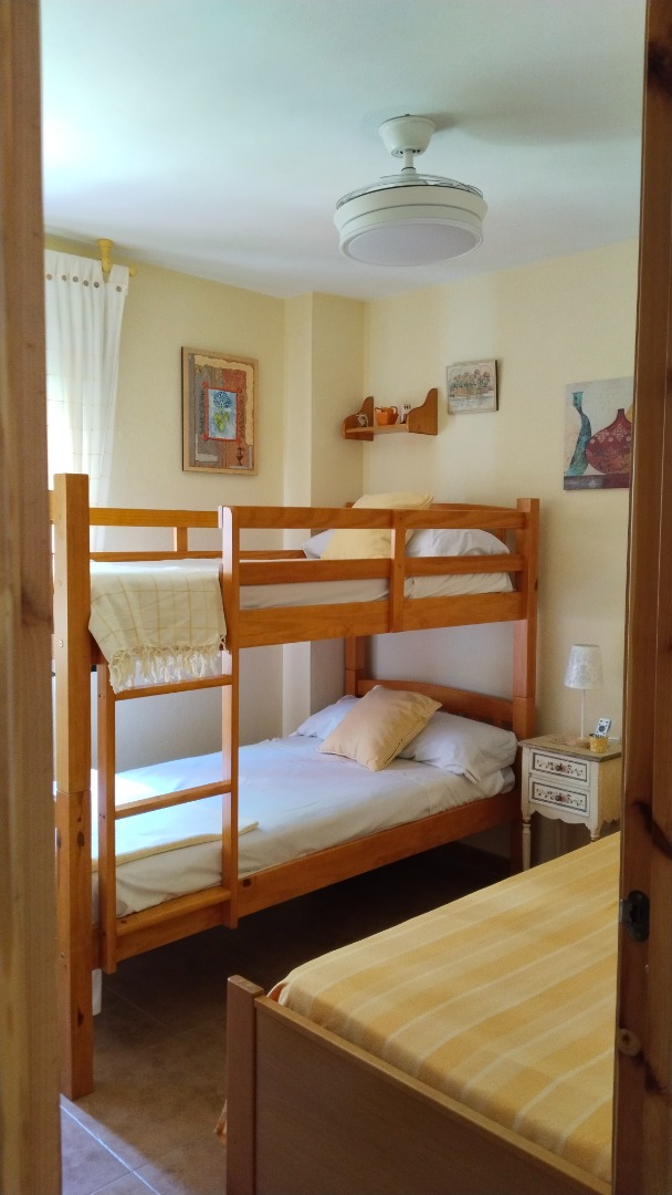 Vivienda declarada para fines turísticos. 1ª planta con ascensor. Tiene 2 dormitorios(1º con cama de matrimonio de 1,35 y 2º con 1 cama individual +1 litera ) 1 cuarto de baño, 1 amplio salón, 1 cocina más terraza lavadero . 1 terraza que comunica al salón y a la cocina. 1 plaza de garaje . Zonas comunes: amplios jardines , zona infantil de juego, 2 piscinas( 1 de adultos y otra de niños), La playa está a unos 200 metros de la urbanización.