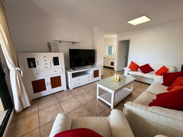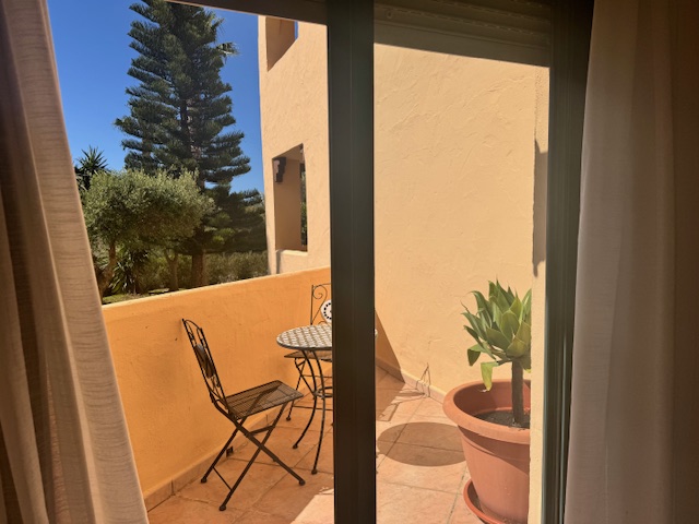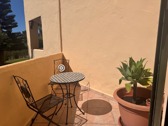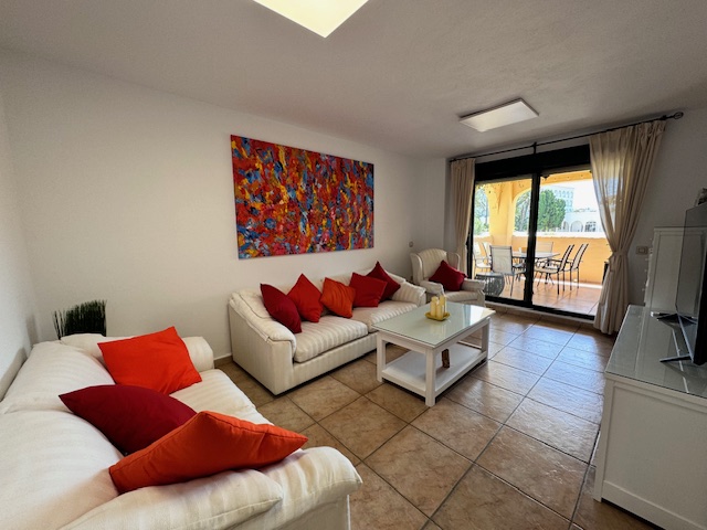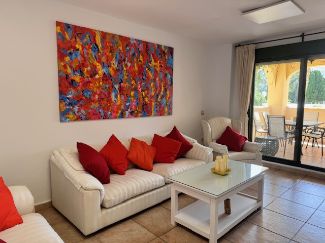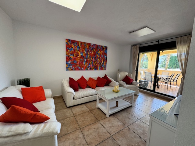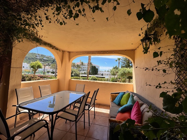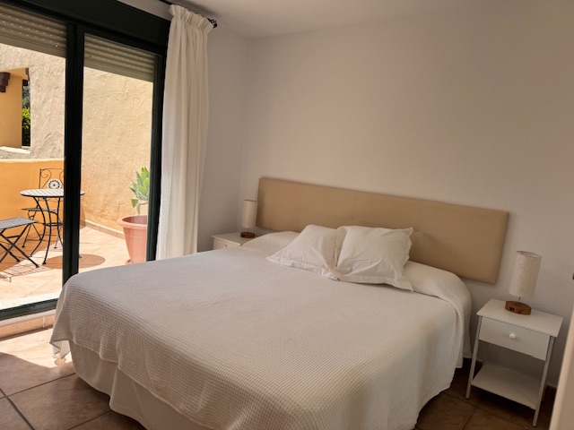 Alquiler de apartamento de 112 m2 en una 1ª planta. Consta de un gran salón, 2 cuartos de baño, cocina, dos amplias terrazas de 14 y 9 m2, patio interior y garaje cubierto. Aire acondicionado en dormitorio ppal. Amplias zonas ajardinadas, con 2 piscinas y 2 pistas de padel