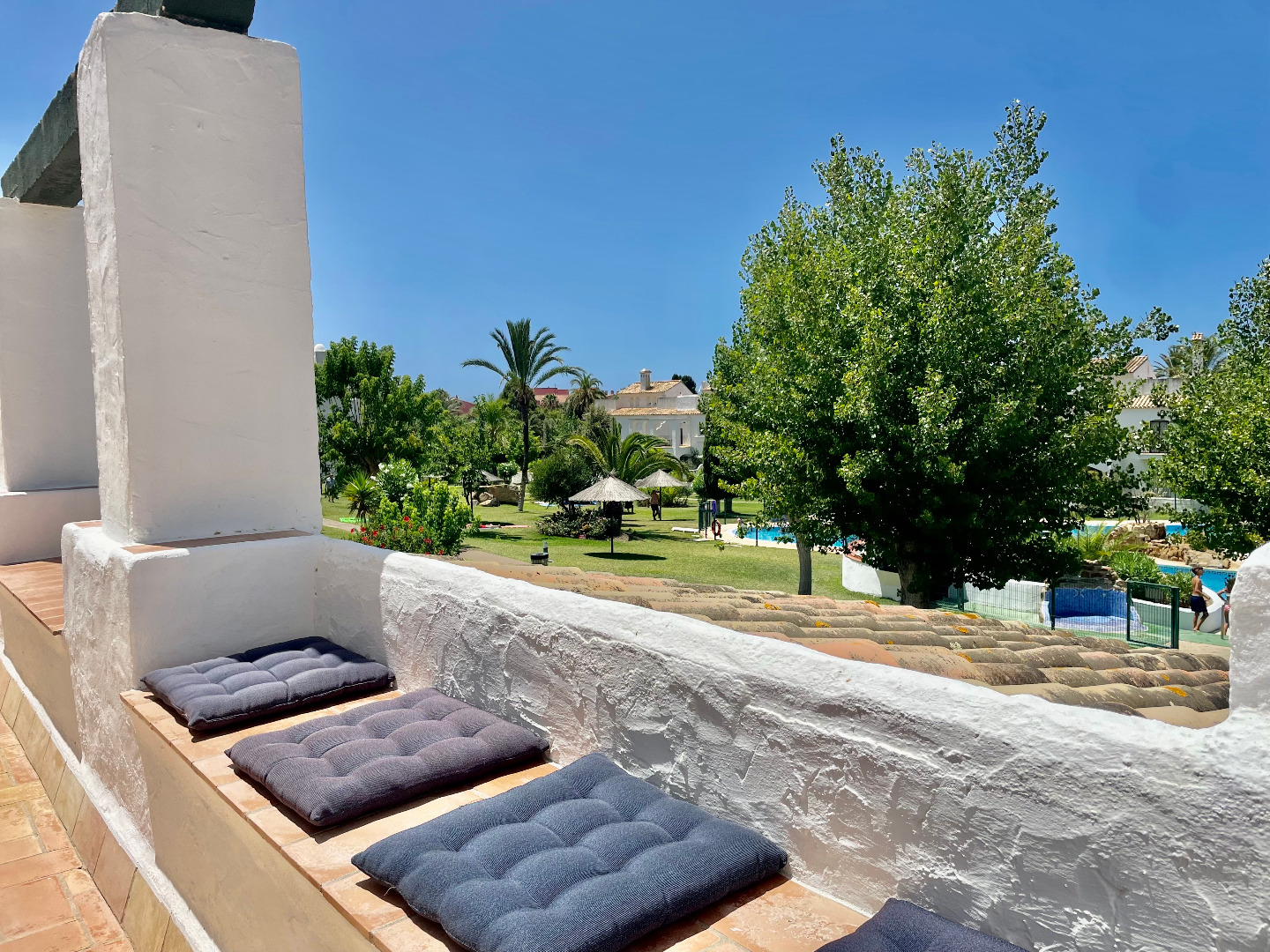 Apartamento para disfrutar y relajarse en familia. En una de las urbanizaciones más bonitas de Zahara de los Atunes, a escasos metros de la Playa de Atlanterra. Totalmente equipado, amplio salón - cocina, dos dormitorios, un baño, preciosa terraza con vistas al jardín y a la piscina, para disfrutar
