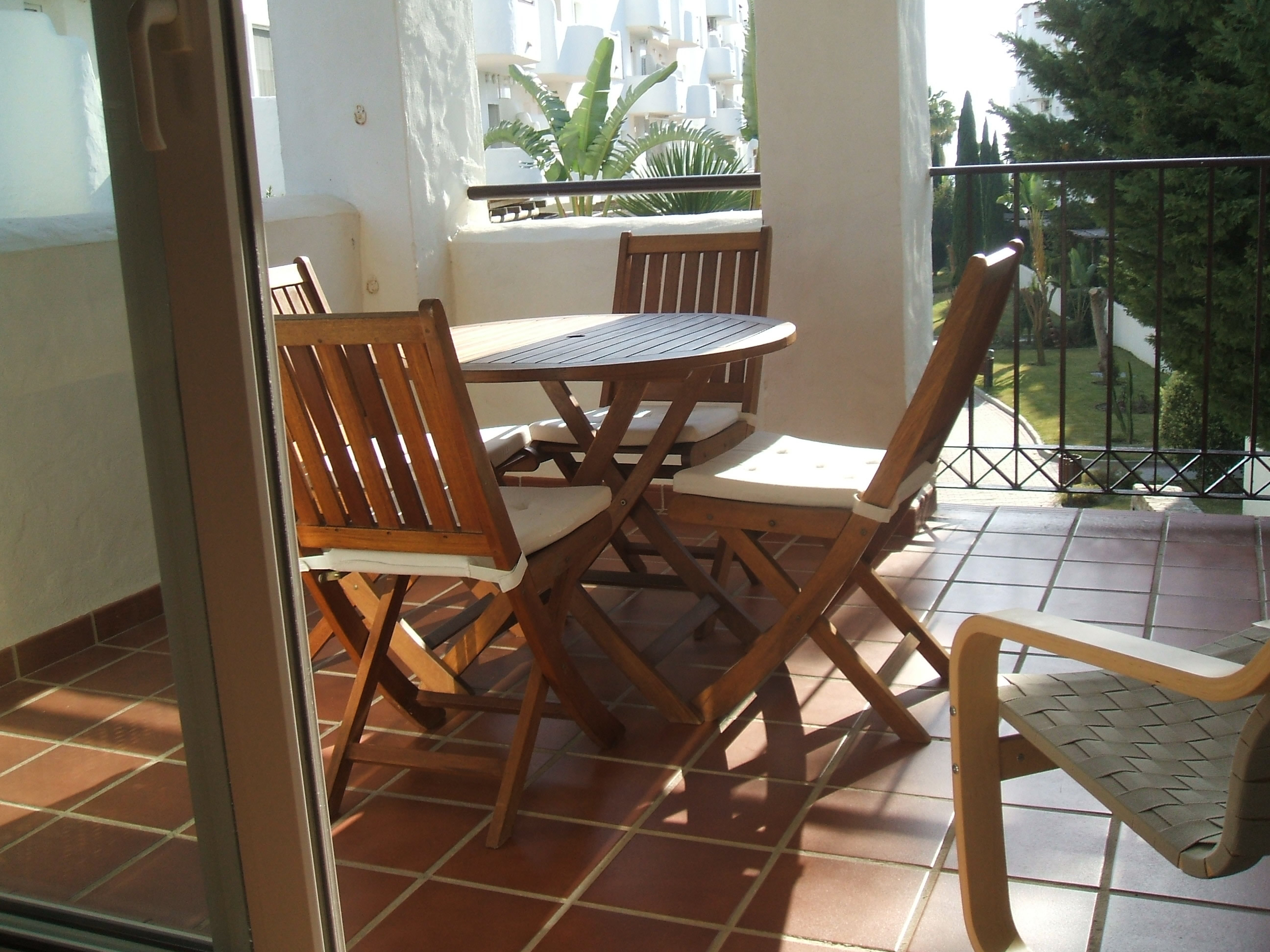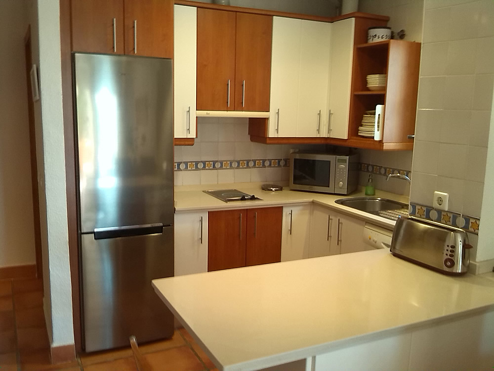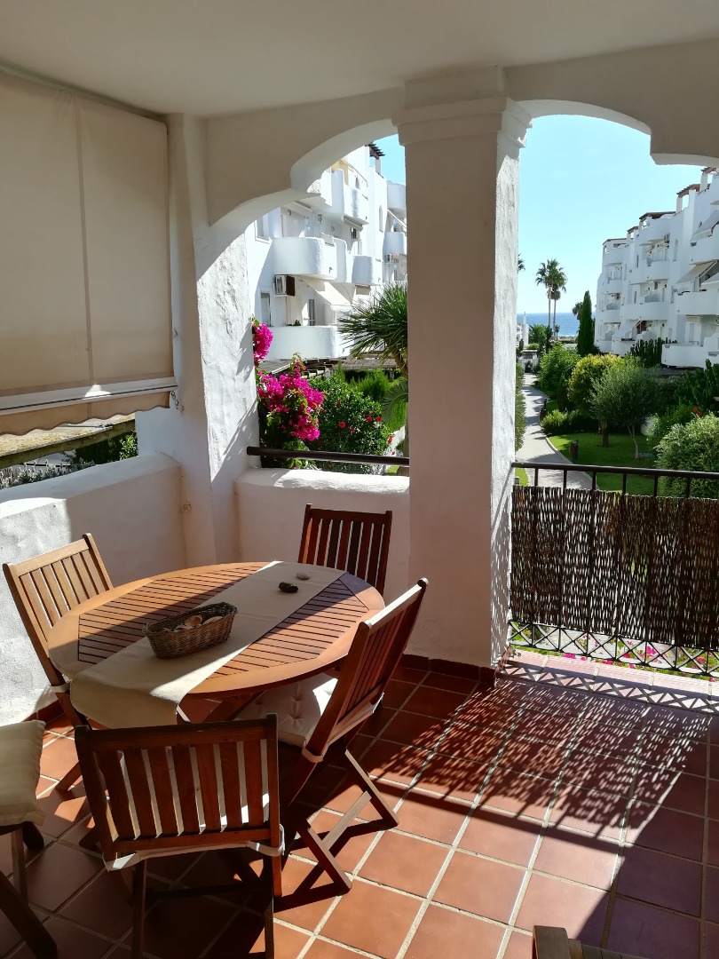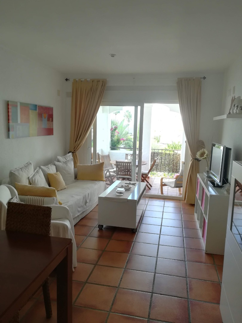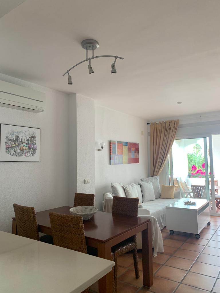 Alquiler de bonito apartamento de 77 m2 situado en una primera planta. El apartamento consta de dos habitaciones, salón, cocina, dos cuartos de baño y dos terrazas, una grande con vistas al mar. También tiene garaje cubierto. La urbanización consta de dos piscinas y dos pistas de paddle.