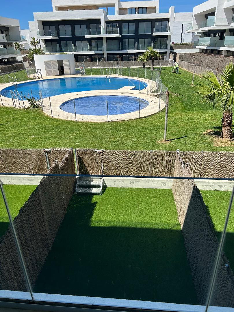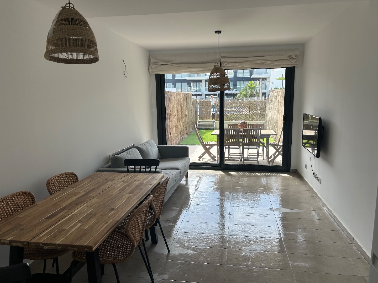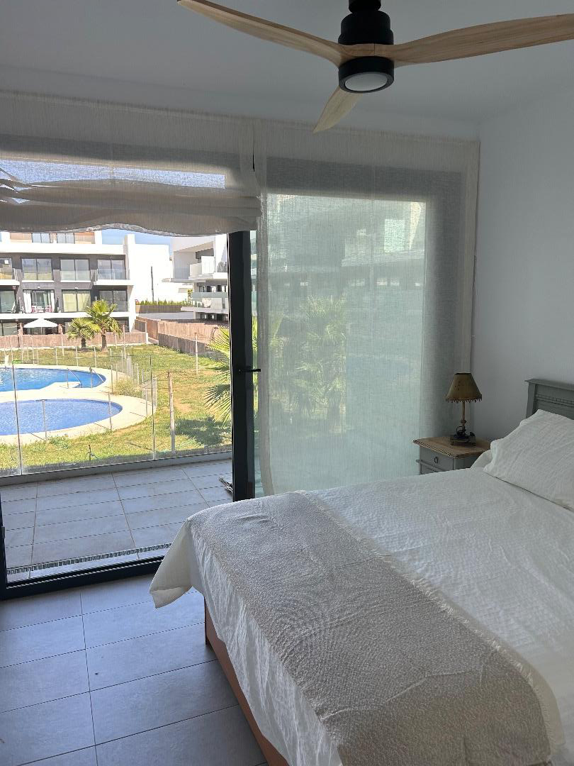 Apartamento nuevo a estrenar de dos dormitorios para 5 personas. Bajo con jardin , piscina y garaje cerrado. Dos baños ,aire acondicionado,wifi