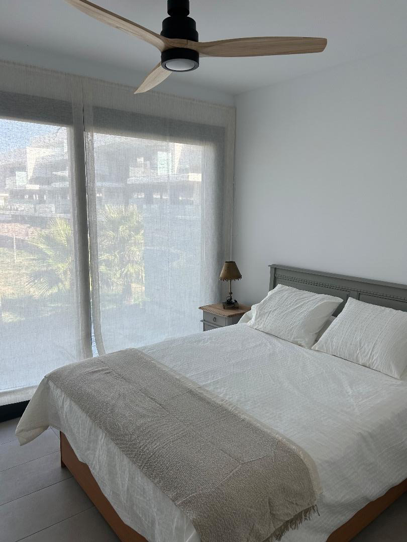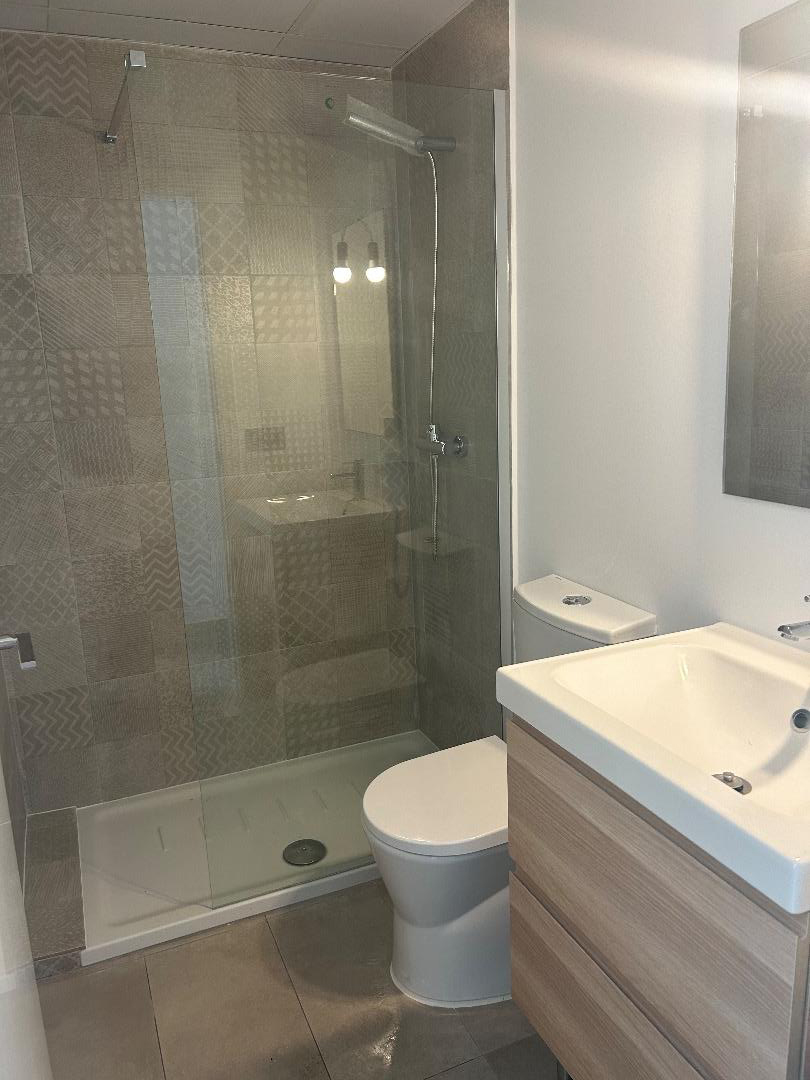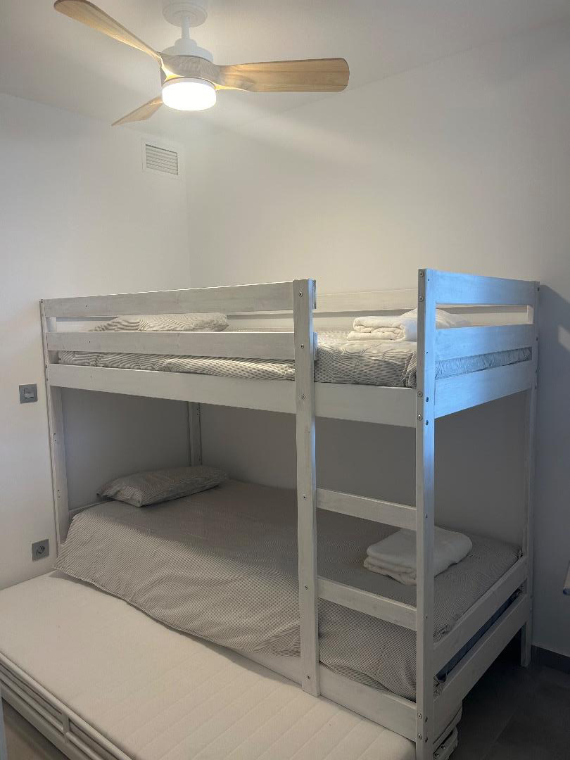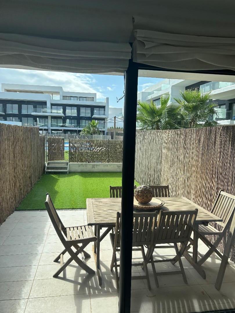 Apartamento nuevo a estrenar de dos dormitorios para 5 personas. Bajo con jardin , piscina y garaje cerrado. Dos baños ,aire acondicionado,wifi